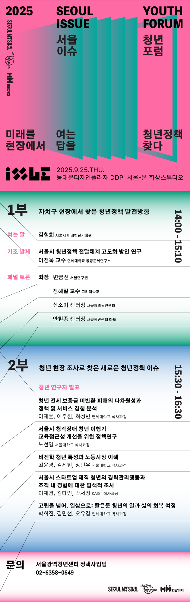 이번 2025 서울청년이슈포럼은 그 성과를 나누고, 정책 실무자·전문가·청년연구자가 한 자리에 모여 청년정책의 미래를 함께 고민하는 소중한 자리입니다.
