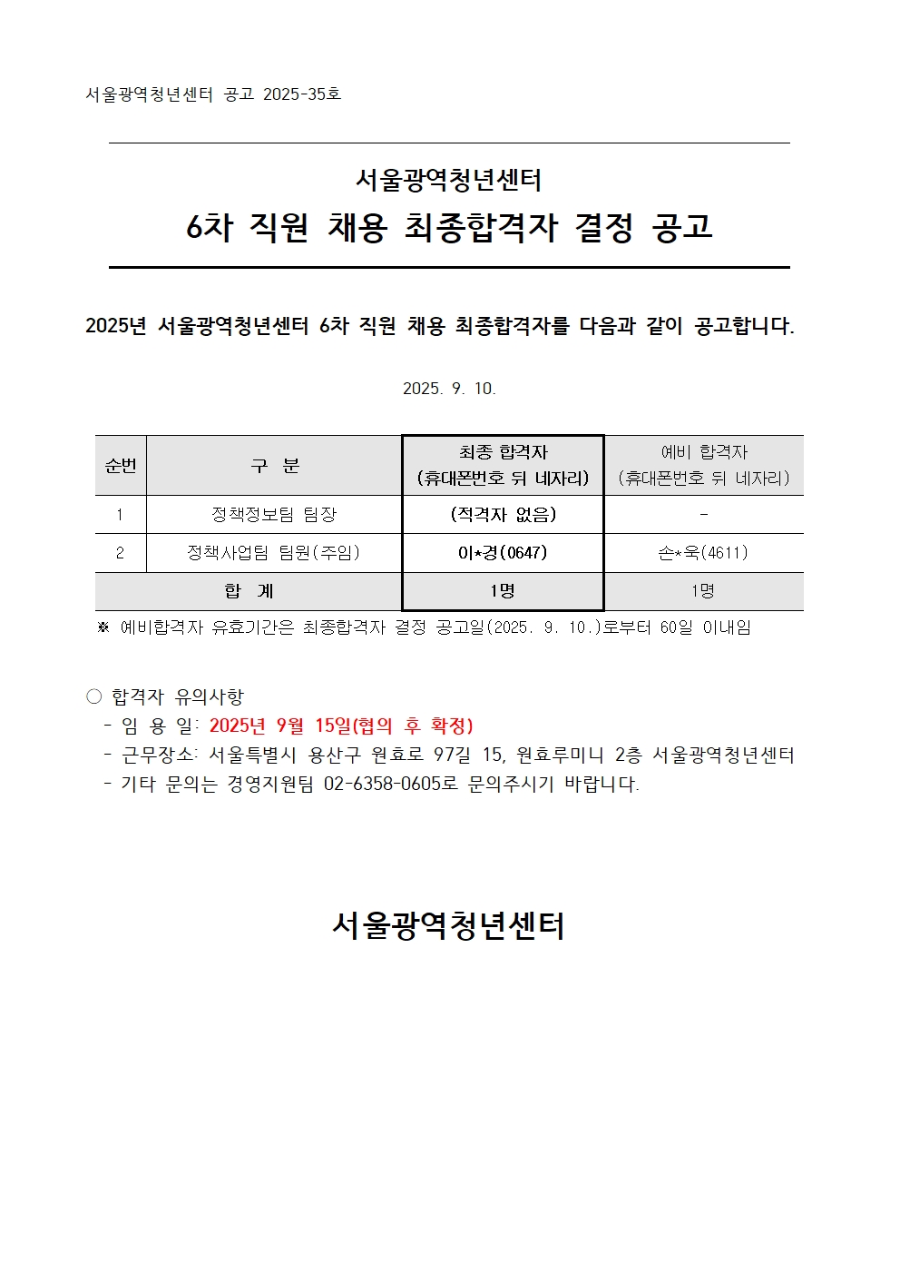 [공고] 2025년 서울광역청년센터 6차 신규직원 채용 최종합격자 결정 공고