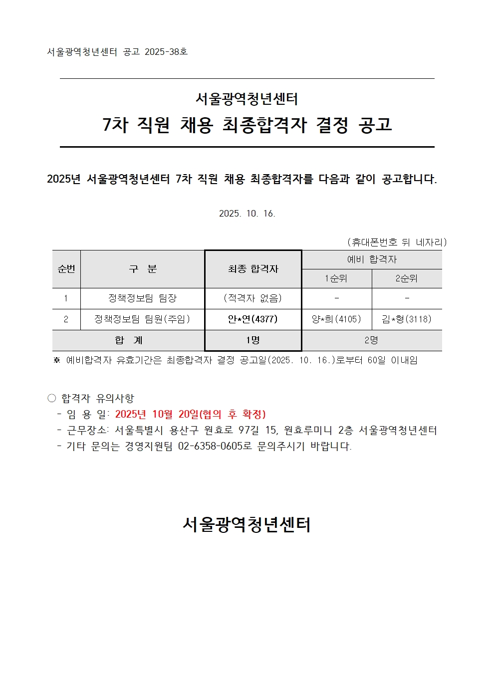 [공고] 2025년 서울광역청년센터 7차 신규직원 채용 최종합격자 결정 공고