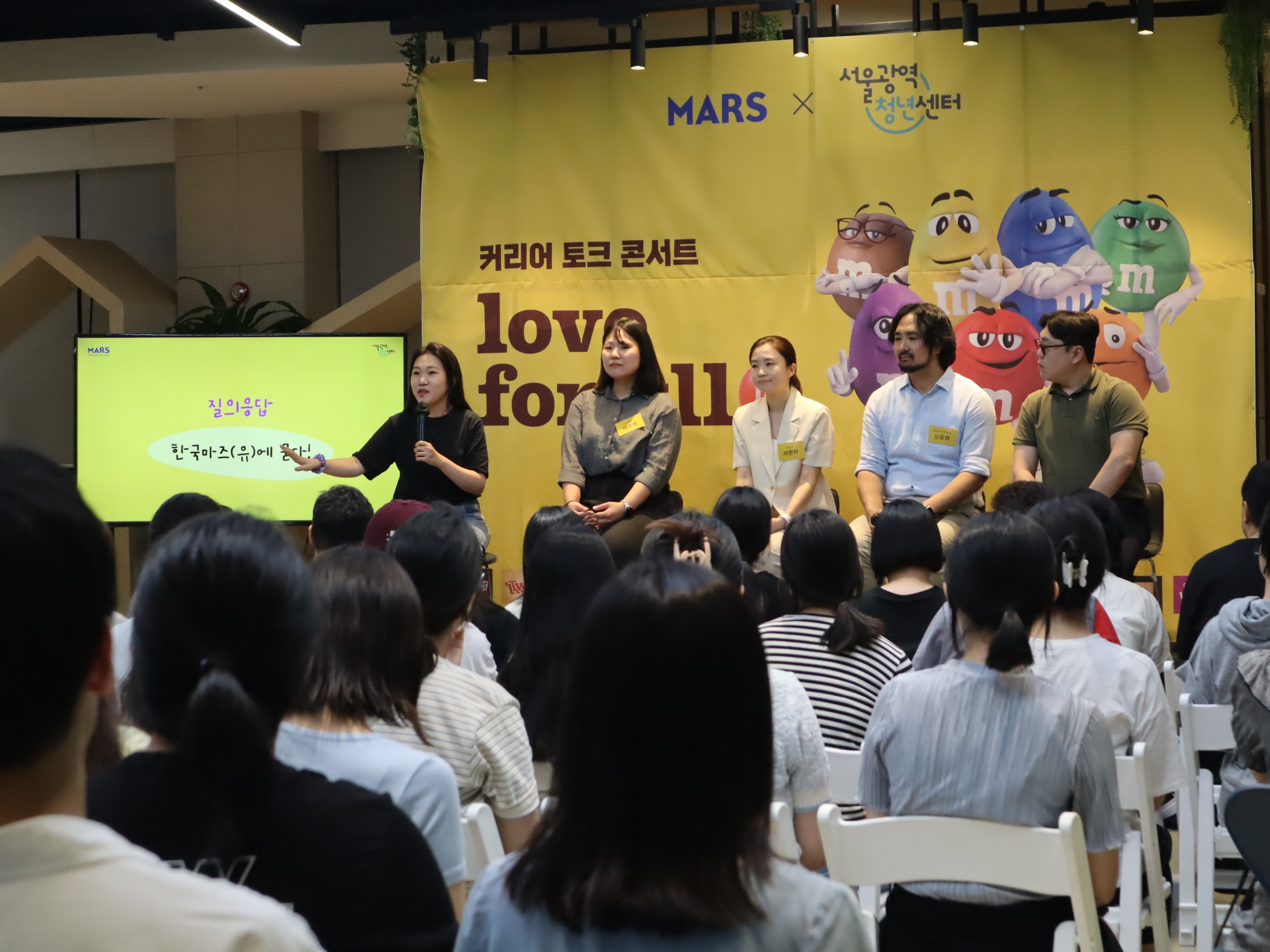 ○ 궂은 날씨에도 불구하고 많은 청년들이 토크 콘서트 현장에 참석했습니다. 서울광역청년센터와 한국마즈(유)에 대한 소개부터, 한국마즈(유) 재직자 네 분의 마케팅/영업/법규(RA)/학술(수의사) 커리어 패스 이야기를 들을 수 있었는데요. 뒤이어 멘토 5분과 함께 사전 및 현장 질의응답을 진행하면서 각 직무와 외국계 기업에 대한 궁금증을 해소할 수 있는 시간이었습니다.