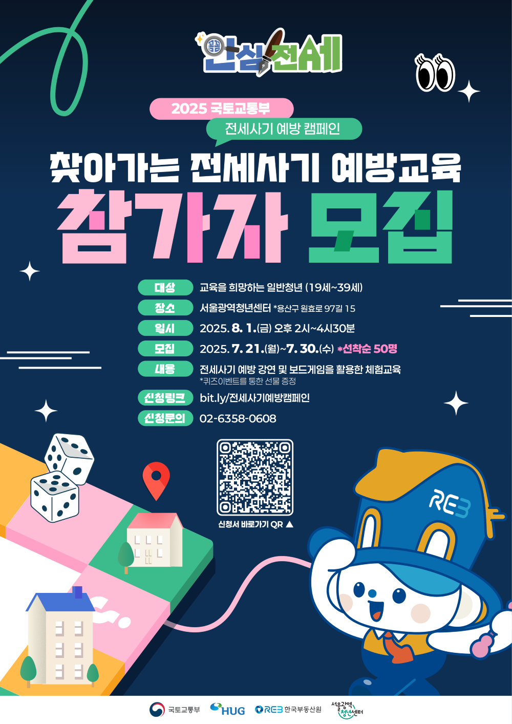 📌 일시: 2025. 8. 1.(금) 14:00~16:30 (예정) 📌 장소: 서울광역청년센터(서울시 용산구 원효루미니 청년주택 2층) 📌 대상: 청년 누구나! (19~39세) 📌 모집인원: 50명(초과시 랜덤 선발 예정) ※참가자 전원 커피 기프티콘 증정☕ 📌 주요 프로그램 1) 전세사기 피해를 막기 위한 실전 예방 교육 강의 2) 보드게임을 활용한 참여형 전세사기 예방 교육 3) 퀴즈이벤트를 통한 경품 증정