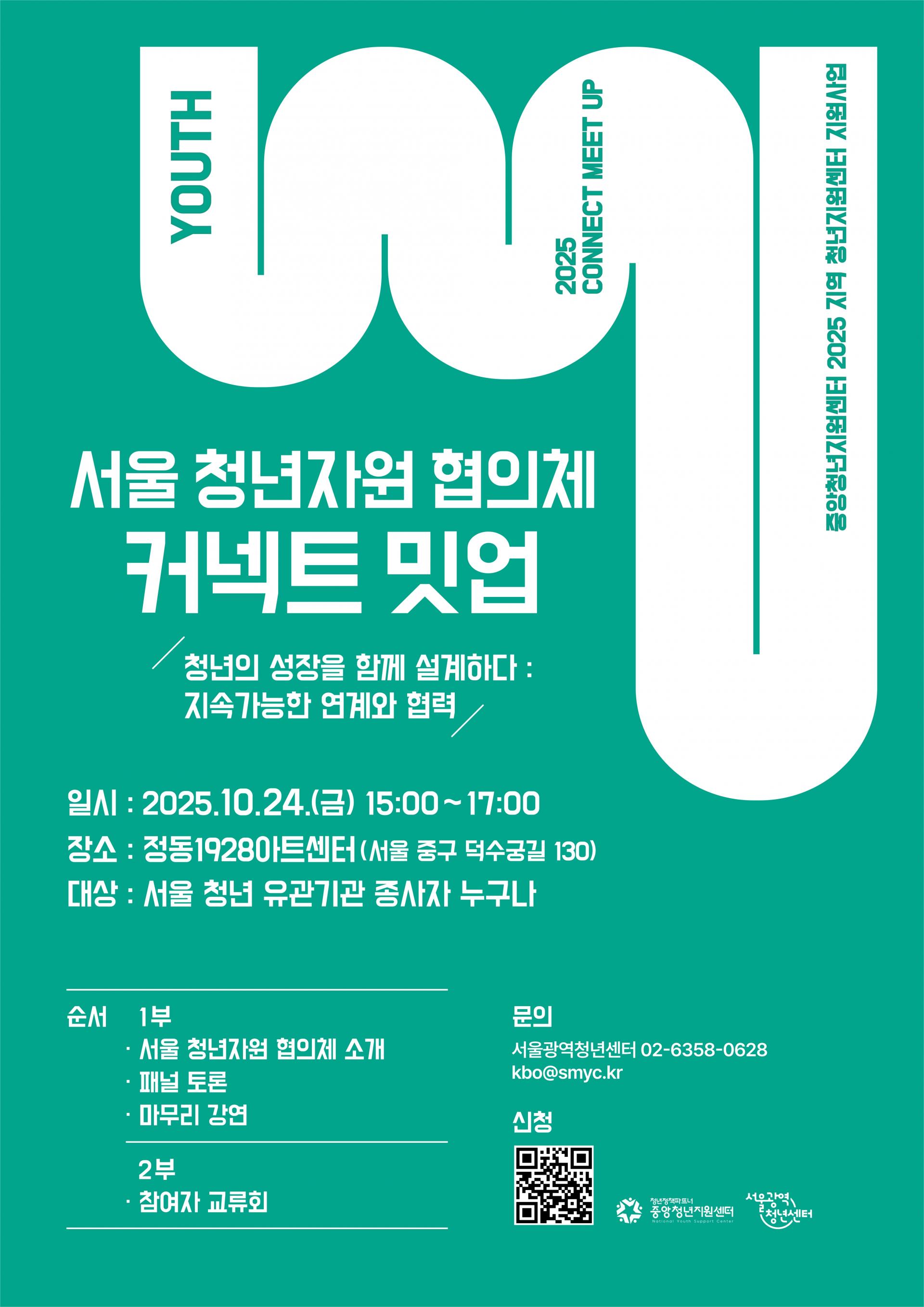 | 신청대상 | 서울 청년 유관기관 종사자 누구나 | 진행일시 | 2025.10.24.(금) 15:00~17:00 | 진행장소 | 정동1928아트센터 (서울 중구 덕수궁길 130) | 신청방법 | 온라인 신청 링크 접속하여 신청 | 문의 | 서울광역청년센터 지역지원팀 02-6358-0628 / kbo@smyc.kr |